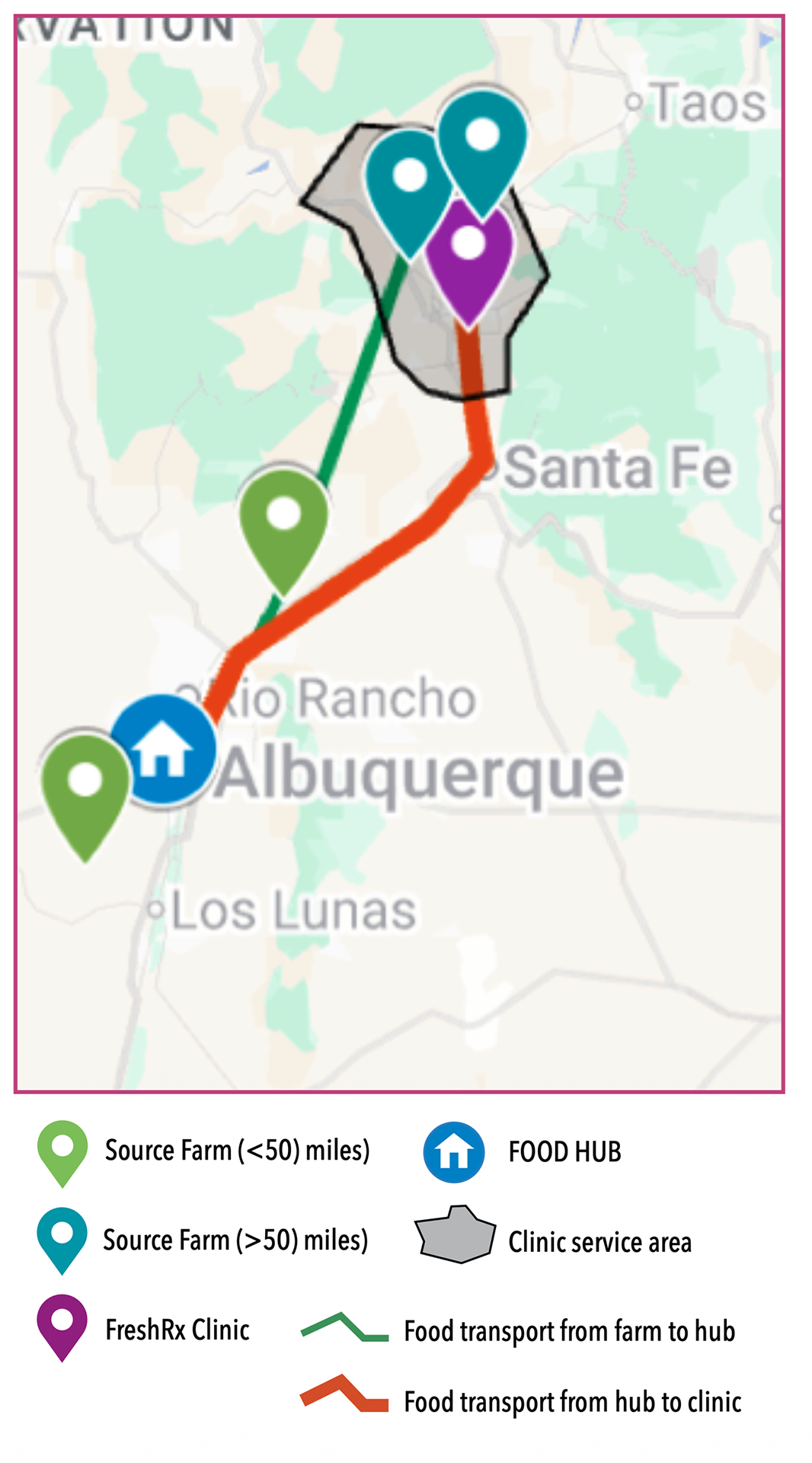 As the legend for the map indicates, the light green-colored source farms are those located within 50 miles of the food hub, and the turquoise-colored source farms are located more than 50 miles from the hub. Green lines show food transport from source farms to the hub, and the orange line shows transport of produce bags from the hub to the clinic. While the supply chain for the Española produce bags represents a local, short food supply chain, looking at the map reveals a gap in adequate aggregation and cold storage infrastructure in northern NM. Finally, the area in gray shows the approximate patient service area for the Española clinic.