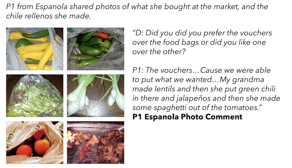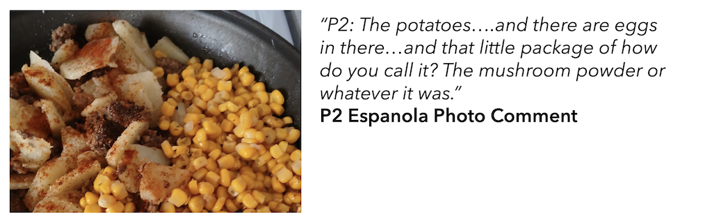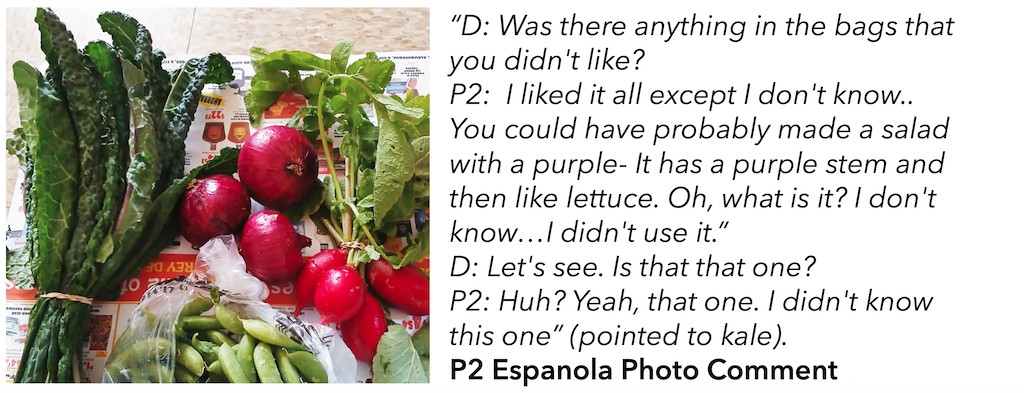 Both participants stated they enjoyed the food that was in the bag, and they were able to incorporate most of the provided items into their usual meal preparations. One participant cooks for her grandmother and boyfriend, and the other participant shares her food with family or neighbors who live in her housing complex. In this section with quotes from the participant interviews, P1 and P2 are the Española participants, and D is the research team member.